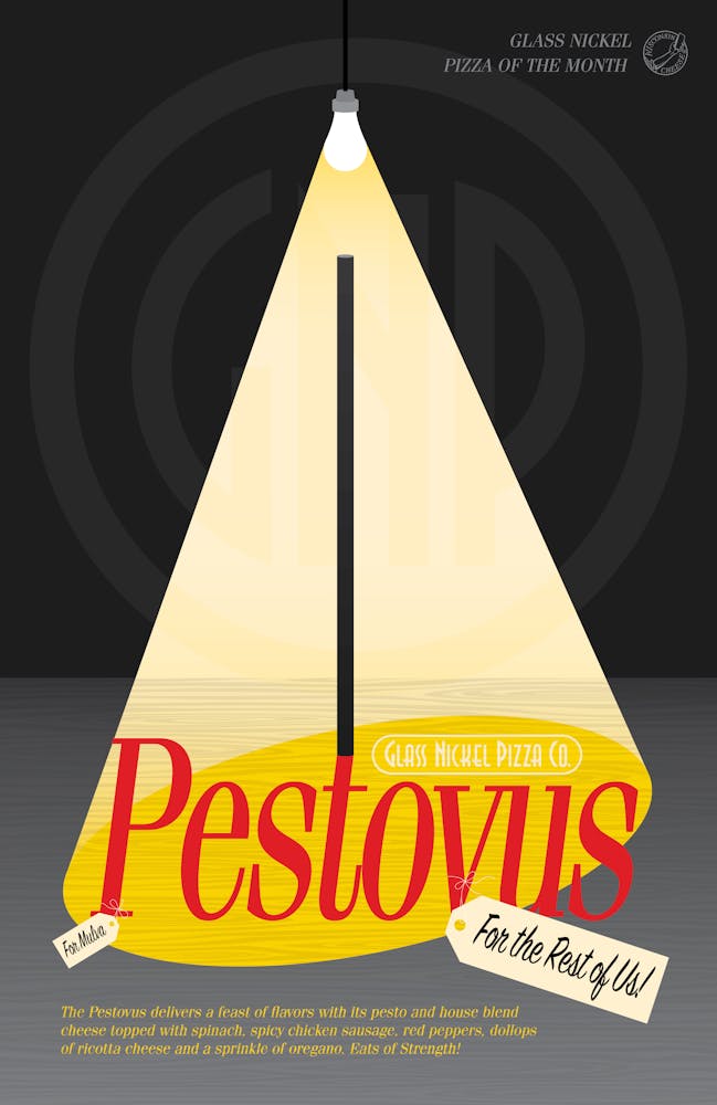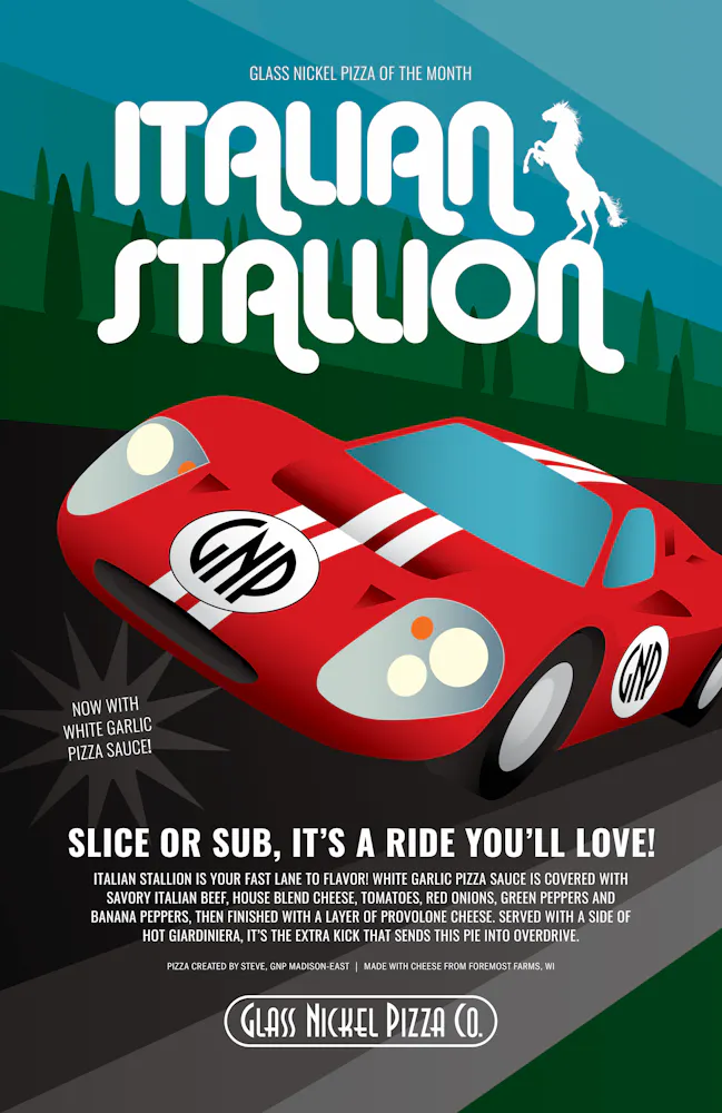 The "Pizza of the Month" began in 2010 at GNP Madison West with a Halloween special, the Pollo Diablo. Our POMs have grown to include special order ingredients, new combinations of current offerings, and recipe ideas from all of our GNP family. Each year we put our heads together for a POM selection party. We bring the best ideas to the table as we start to plan for the year ahead. We pick 6 of our favorites, then have our amazing design team come up with vintage movie poster themed images for each. Now, for the first time ever, we have collected and organized a history of ALL of our Pizza of the Month creations in one place! Take a look to see what our current feature is, the pizzas you loved from the past, which ones you might have missed, and which ones you hope we bring back!